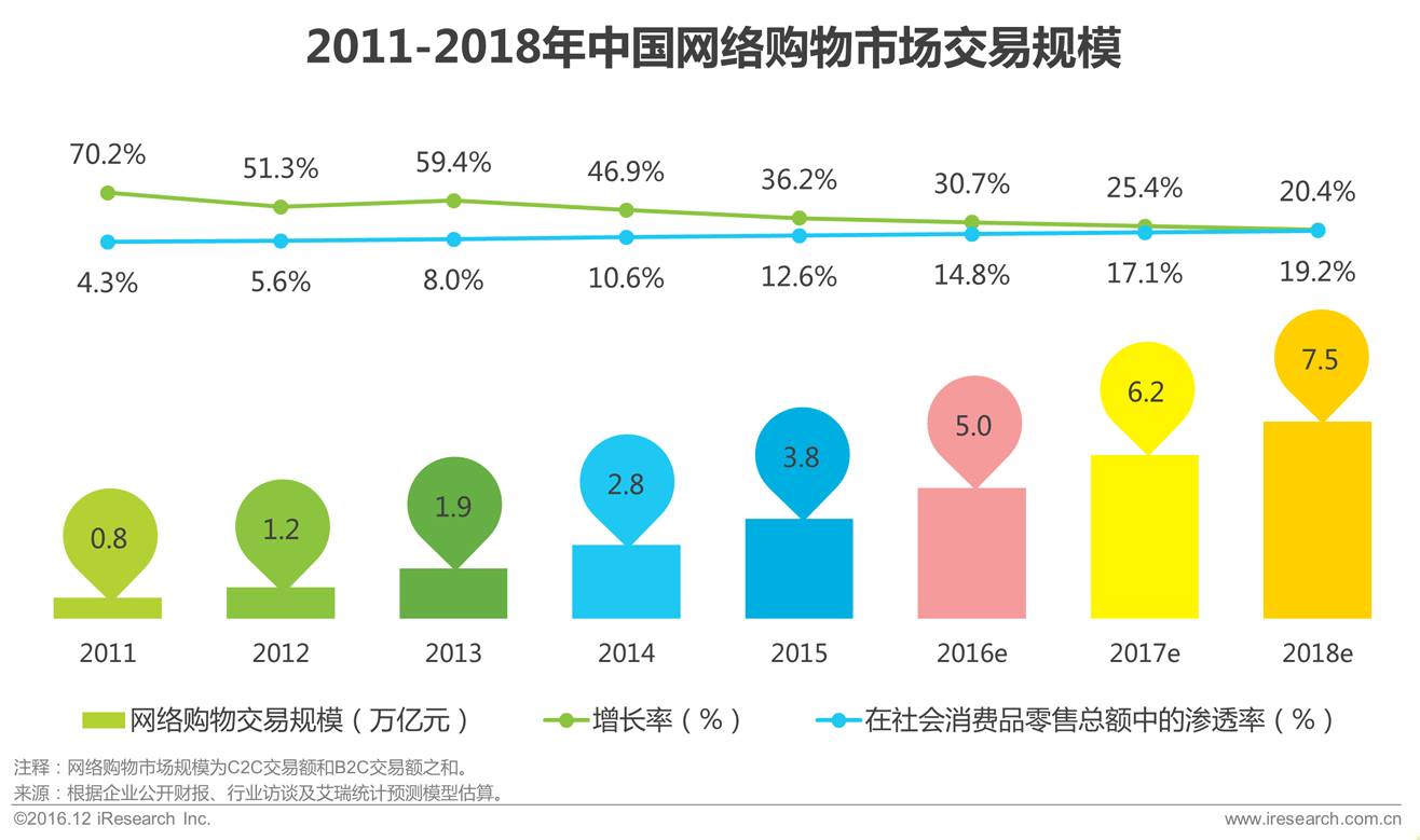2015年中国网络购物市场交易规模达3.8万亿元,同比增长36.2%,保持稳定的增长水平,预计2016年将达5万亿。