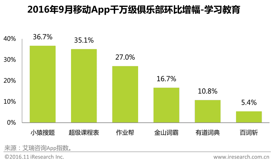 学习教育大类的6个App月度独立设备数增幅均超过5%,小猿搜题和超级课程表甚至达到35%以上,越来越多的用户变身学霸。