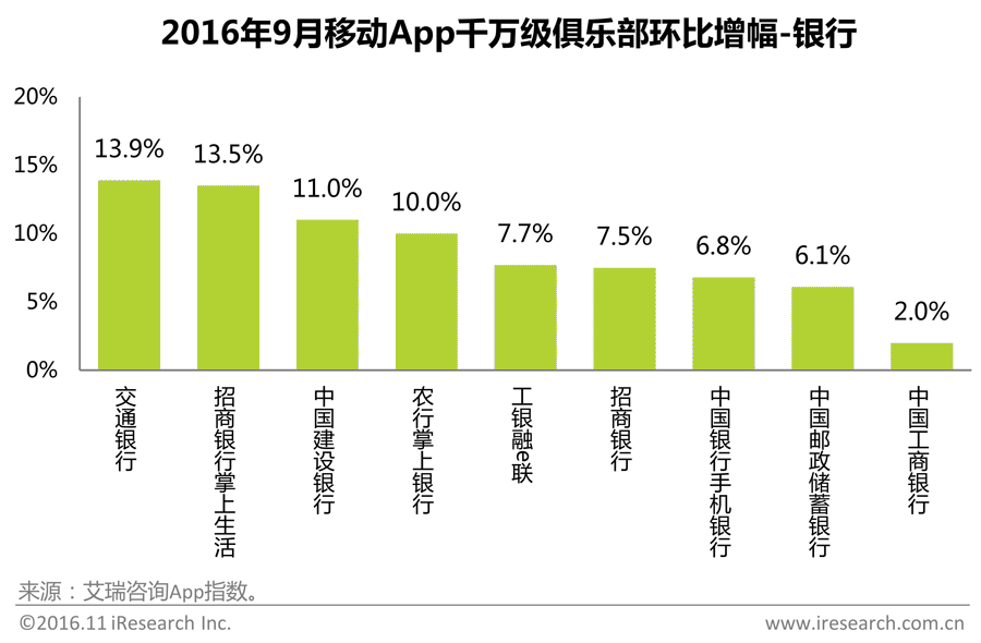 千万级俱乐部中银行小类共有9个App,月度独立设备数环比增幅均为正,其中交通银行环比增幅达到13.9%,招商银行掌上生活为13.5%,使用移动端银行服务的用户数量正在逐步扩大。