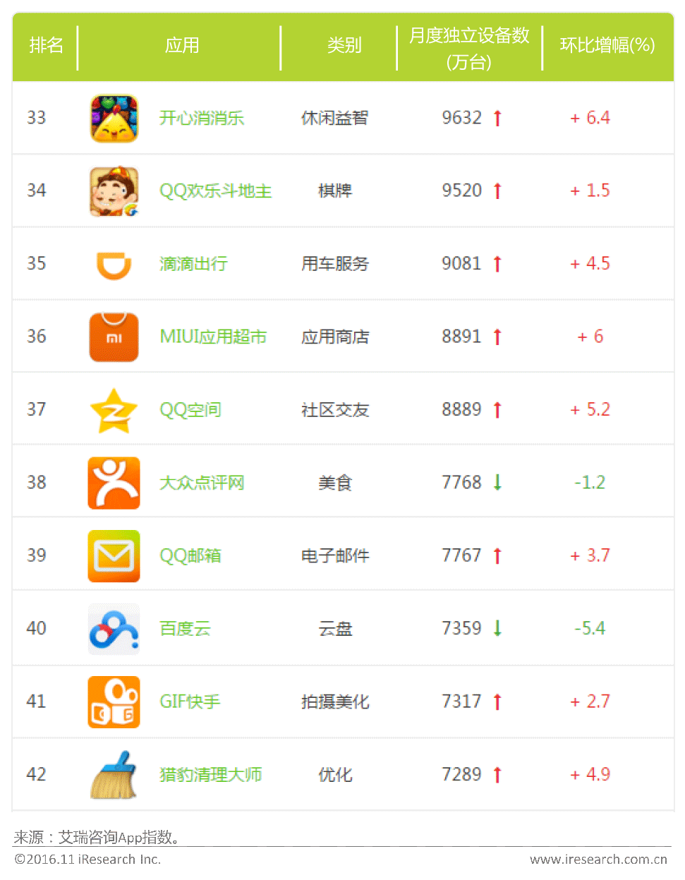 从App千万级俱乐部Top10来看,腾讯是当之无愧的霸主,开心消消乐、QQ欢乐斗地主、QQ空间、QQ邮箱皆为其旗下产品。从App大类别来看,游戏服务类App高居榜首,开心消消乐及QQ欢乐斗地主获用户喜爱;实用工具类App也凭借MIUI应用超市和猎豹清理大师获得两席。从月度覆盖设备数来看,QQ空间和大众点评网相差了超过一千万的设备覆盖,形成较明显的断层。从环比增幅来看,整体波动不大,除大众点评网和百度云略有下降,其他App都有小幅增长。