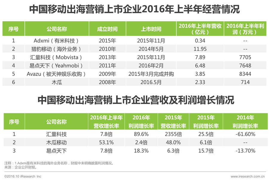 目前出海营销领域,形成规模的企业均已上市新三板(猎豹移动上市纽交所),或被上市公司收购(Avazu被天神娱乐收购)。部分出海业务隶属于上市公司,未披露财报数据(PandaMobo隶属于久其软件)。企业上市时间多集中在2015年底至2016年初,上市时间较短。