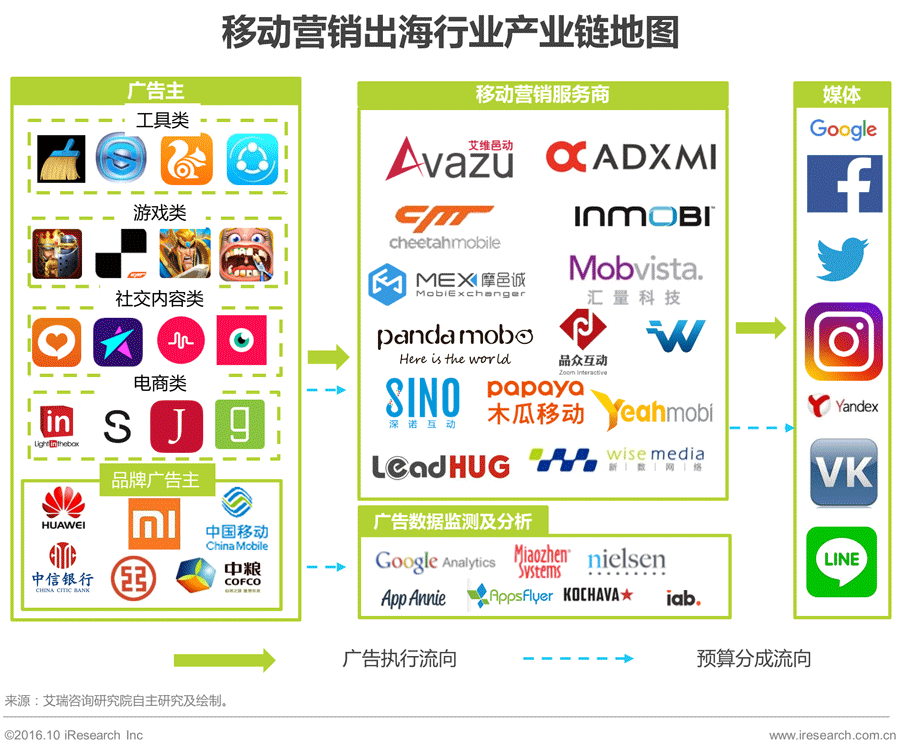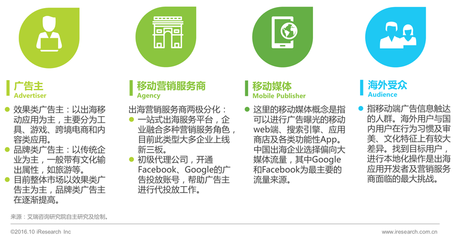 广告主、营销服务商、移动媒体、海外受众构成主要参与者