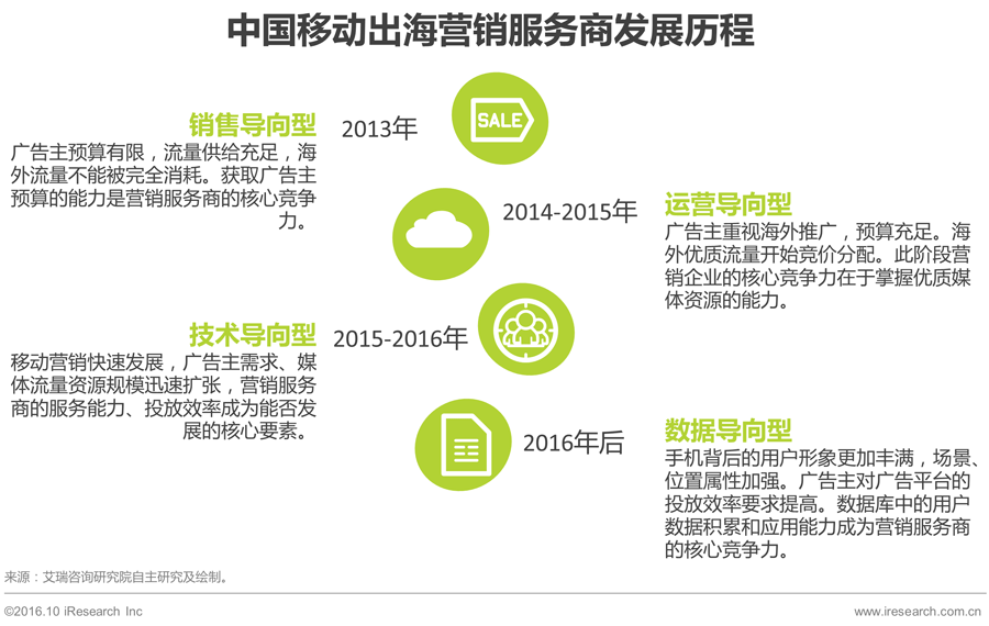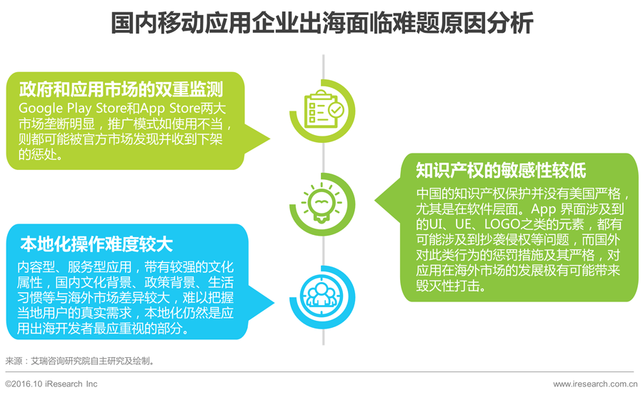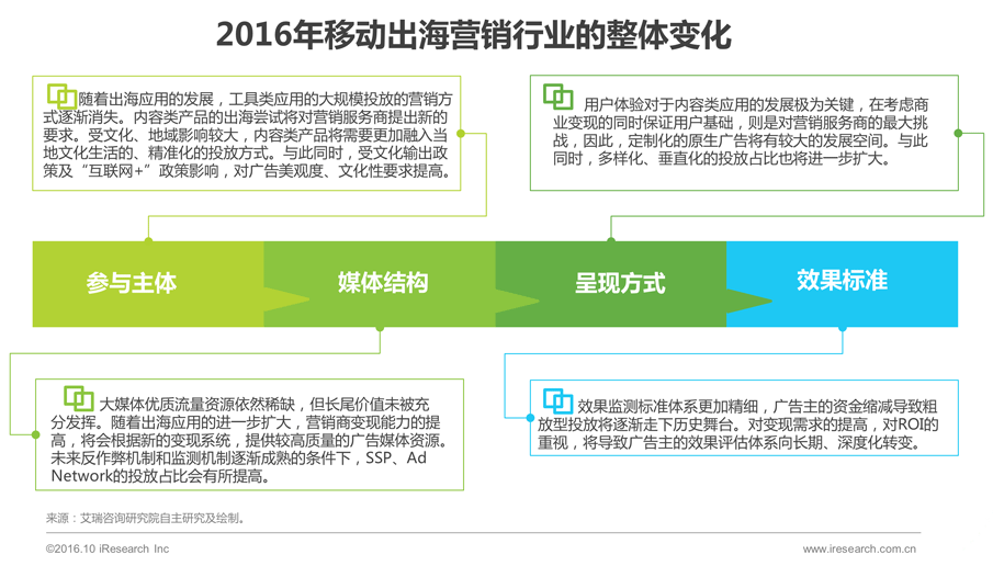 艾瑞分析认为,移动互联网市场经过成长,拥有了资金、技术、人才的资源积累,而海外市场经过6年左右的发展,部分领域已进入成熟期,传统的工具类应用逐渐触及天花板,从2016年开始,出海应用产品需要考虑转型。
