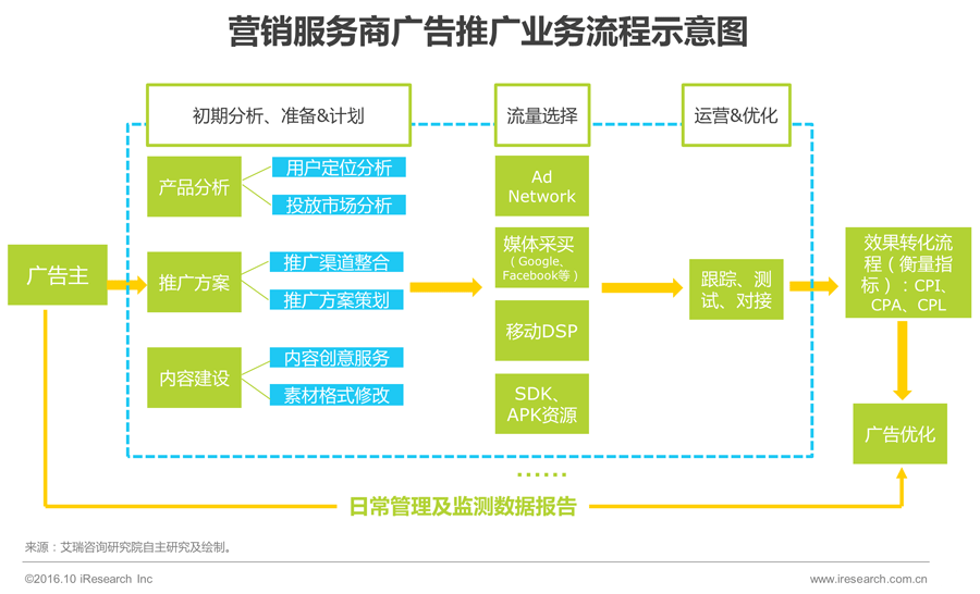 广告推广是营销服务商提供的重要营销服务之一,在如下环节中, 服务商主要是按照广告投放后为广告主直接创造的效果进行收费并且向渠道资源方支付广告投放费用或者流量费用。盈利模式以效果为导向,通过CPA、CPS、CPC等方式收费。除此外,部分企业在前期分析阶段,通过提供素材创意、进行素材格式改造等服务,收取服务费。