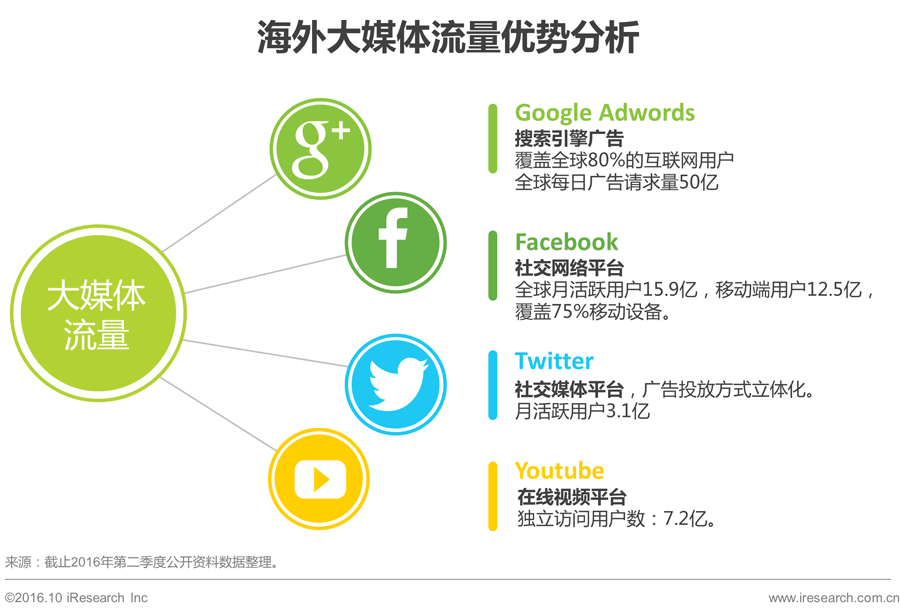 艾瑞分析认为,根据全球用户流量分布,搜索引擎、社交产品、视频媒体的用户基础较大,在全球市场流量较为集中。因此较受广告主和营销服务商的欢迎。