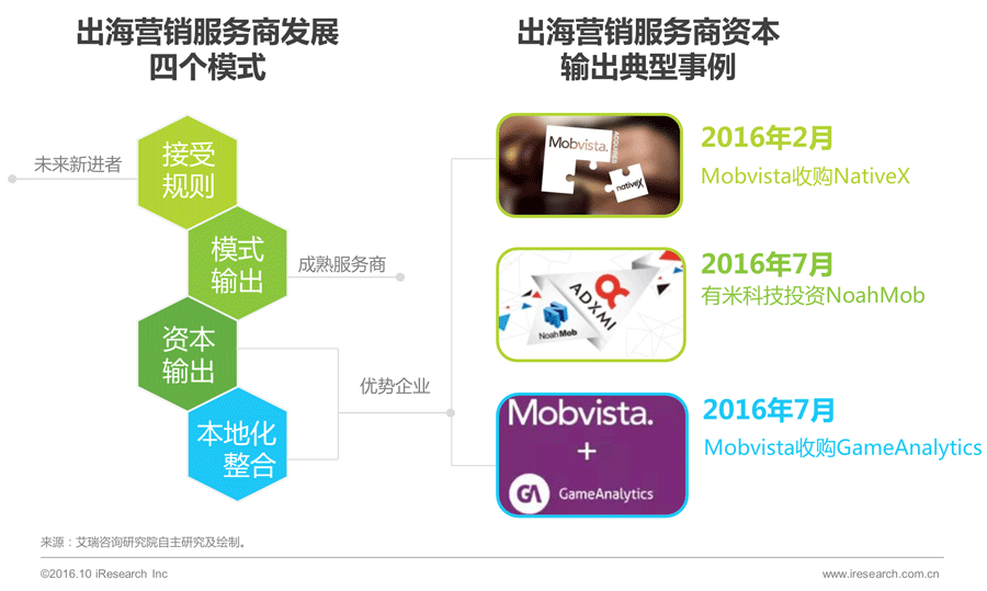目前大多数发展成熟的营销商已跨越被动接受规则阶段,进入模式输出阶段,而领先企业已进入资本输出及本地化整合的过渡阶段,逐渐开展资本输出,通过收购海外营销服务商,补充用户数据及流量、技术资源,加强本地化能力。